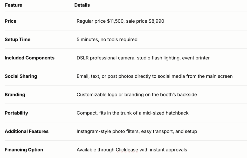 The 24MP DSLR camera captures crystal-clear, professional-quality photos that guests immediately want to share. The built-in studio flash ensures perfect lighting every time. The setup takes just 5 minutes with no tools required. Everything is housed in one sleek, transportable case. Guests are getting instant 4×6 prints that rival professional photography studios, and they’re posting their photos to social media in real-time, essentially marketing your business for you.